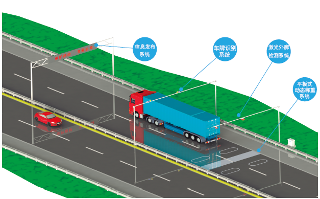 系統(tǒng)采用平板式動態(tài)稱重系統(tǒng)為核心稱重設備,利用其稱量準確度高,數(shù)據(jù)離散度小等特點,對行駛中的車輛實施精準稱重檢測。